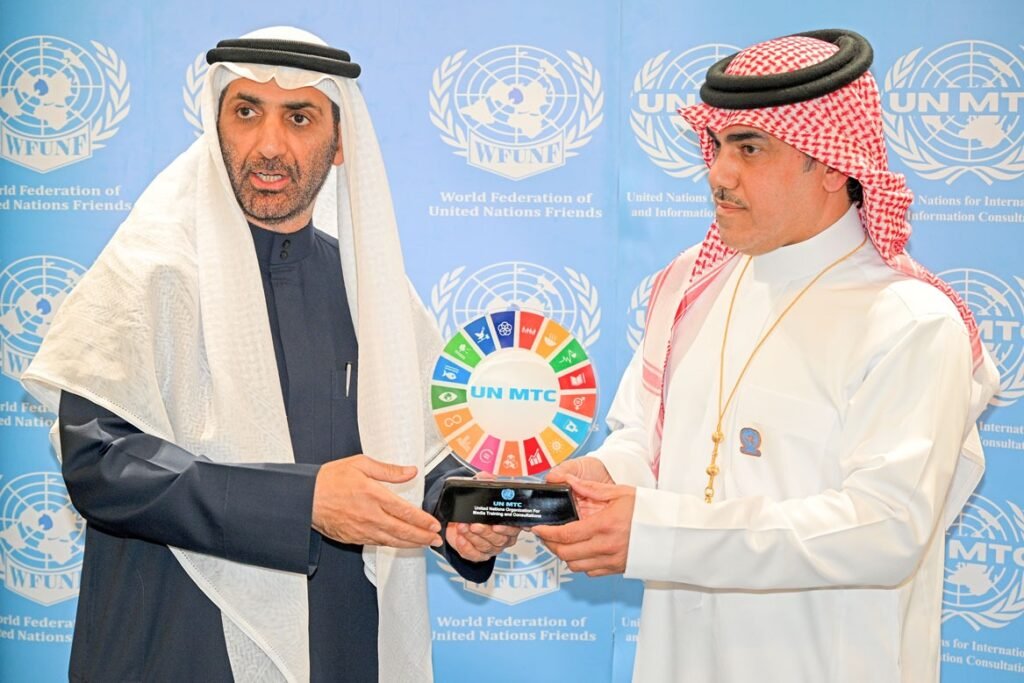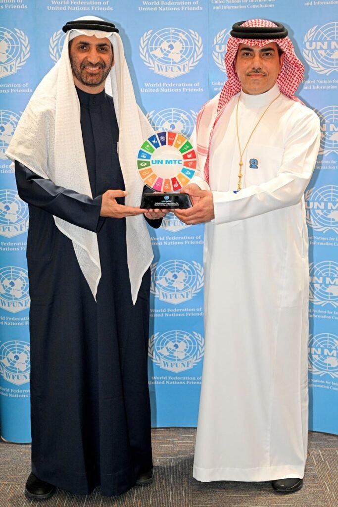 At the headquarters of Arab Tourism Magazine in the Kingdom, His Highness Sheikh Abdulaziz bin Ali Al-Nuaimi was awarded the Influential Leader Award for Green Environment and Gold Membership from the United Nations Training and Communications Organization (UNMTC), along with the organization’s Shield for Sustainable Development. The award was presented by Engineer Abbas Al-Ibrahim, Director General of UNMTC in the Kingdom of Saudi Arabia and the Gulf States, and Chairman of the Board of Directors of Arab Tourism Magazine.